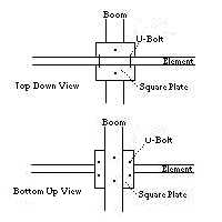 The elements are fastened to the boom by attaching to 1/8 inch thick, 3 inch square aluminum mounting plates, using home made U-bolts.